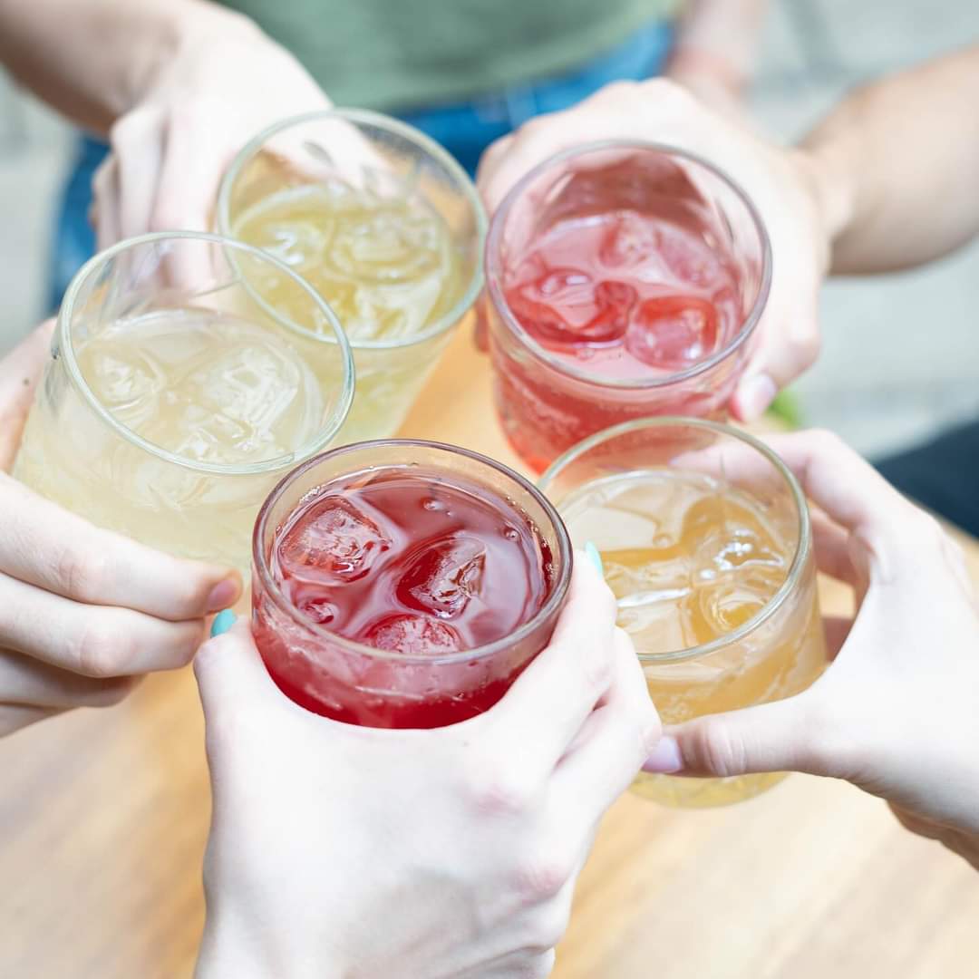 12 unidades de bebida probiótica elaborada a base de té verde y cultivo de kombucha con sabor a fresa, mora y pétalos de rosa. Producto de color rosado-rojo.