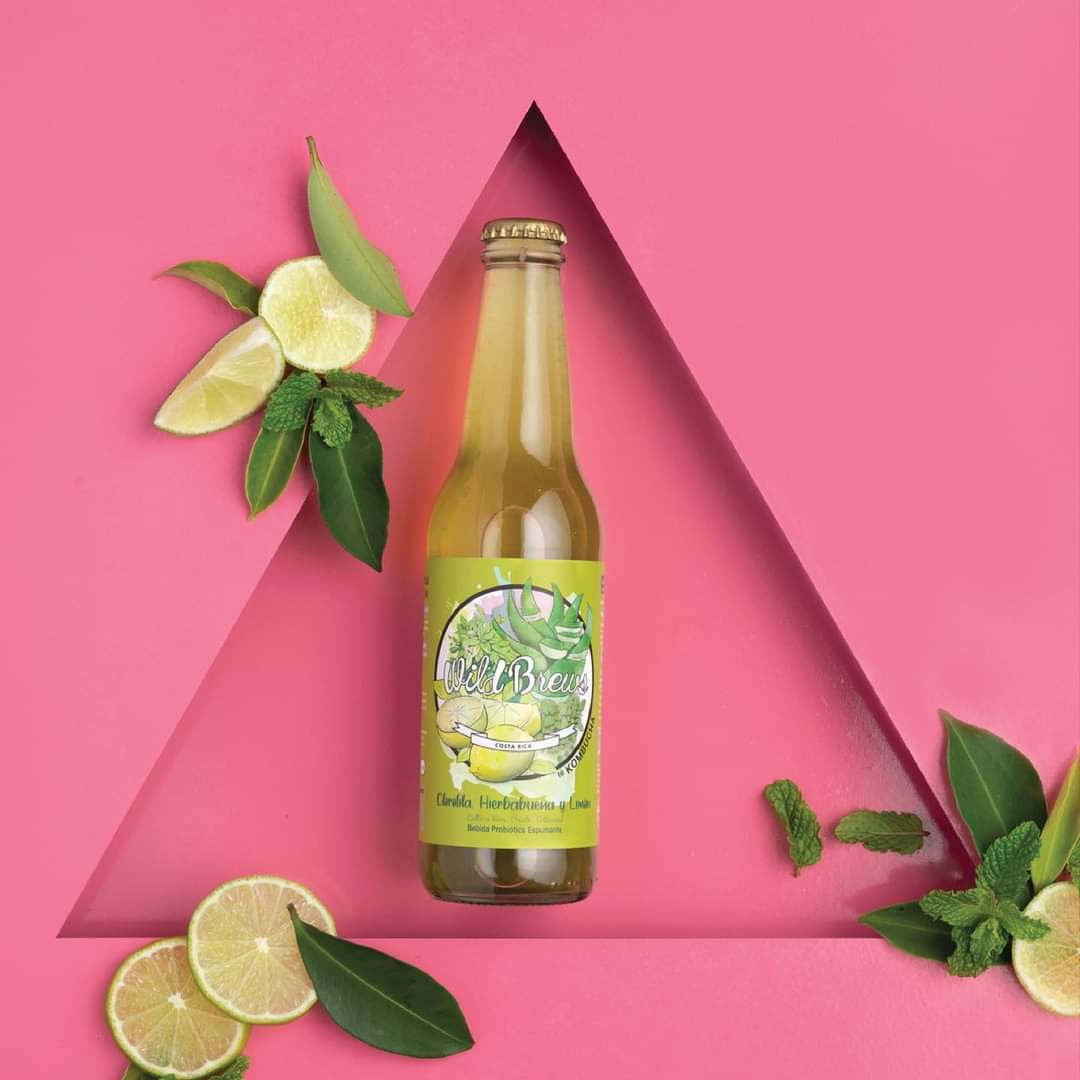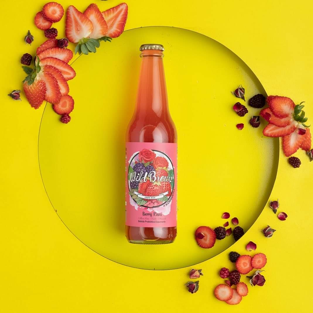 12 unidades de bebida probiótica elaborada a base de té verde y cultivo de kombucha con sabor a fresa, mora y pétalos de rosa. Producto de color rosado-rojo.